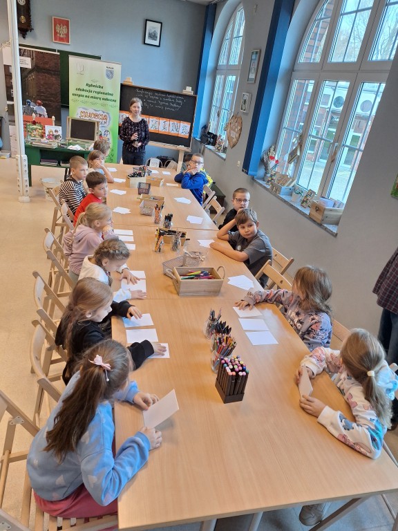Klasa 2b na zajęciach w Centrum Edukacji Regionalnej. Uczniowie podczas gry edukacyjnej próbowali odkryć tajemnice Rybnika. Na zajęciach praktycznych wykonali książeczkę w formie komiksu.