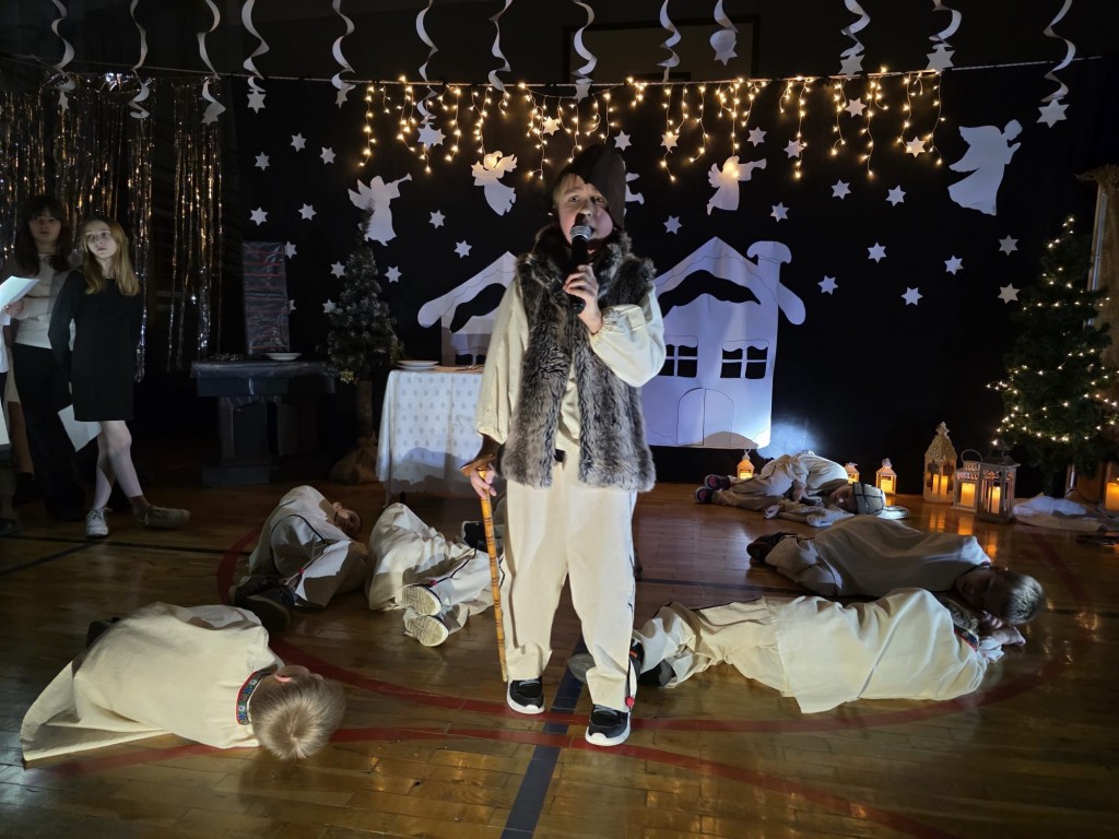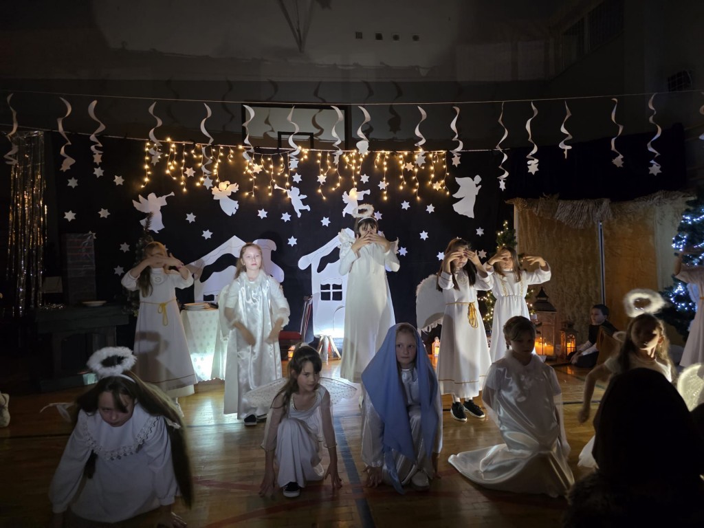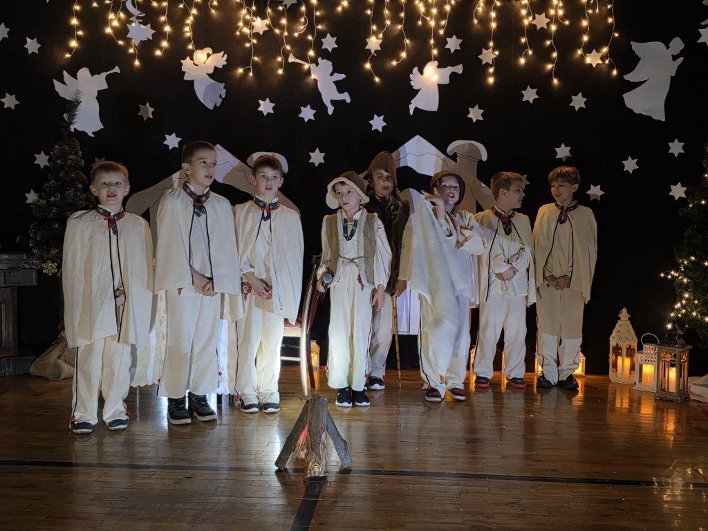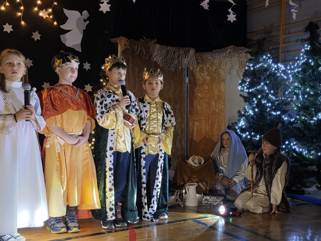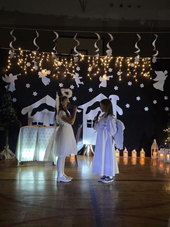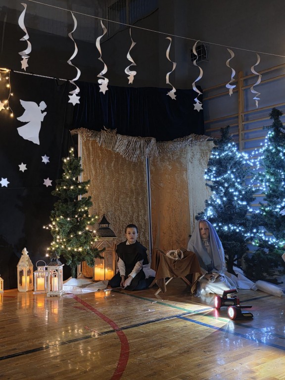 W pierwszej części odbyły się jasełka, które wprowadziły wszystkich w świąteczny nastrój. Uczniowie zaprezentowali pełne zaangażowania widowisko, łączące tradycyjne kolędy i pastorałki z krótkimi scenkami teatralnymi. Przedstawienie było bardzo piękne i zostało nagrodzone gromkimi brawami. Kolejna część uroczystości poświęcona była kolędowaniu oraz prezentacji laureatów szkolnego przeglądu kolęd i pastorałek. Następnie uczniowie, nauczyciele oraz rodzice mogli odwiedzić kiermasz świąteczny, na którym zaprezentowano ręcznie wykonane ozdoby, kartki, stroiki i inne bożonarodzeniowe dekoracje. W szkolnej kawiarence można było zakupić pyszne domowe ciasta oraz wypić kawę i herbatę. Kiermasz cieszył się dużym zainteresowaniem.